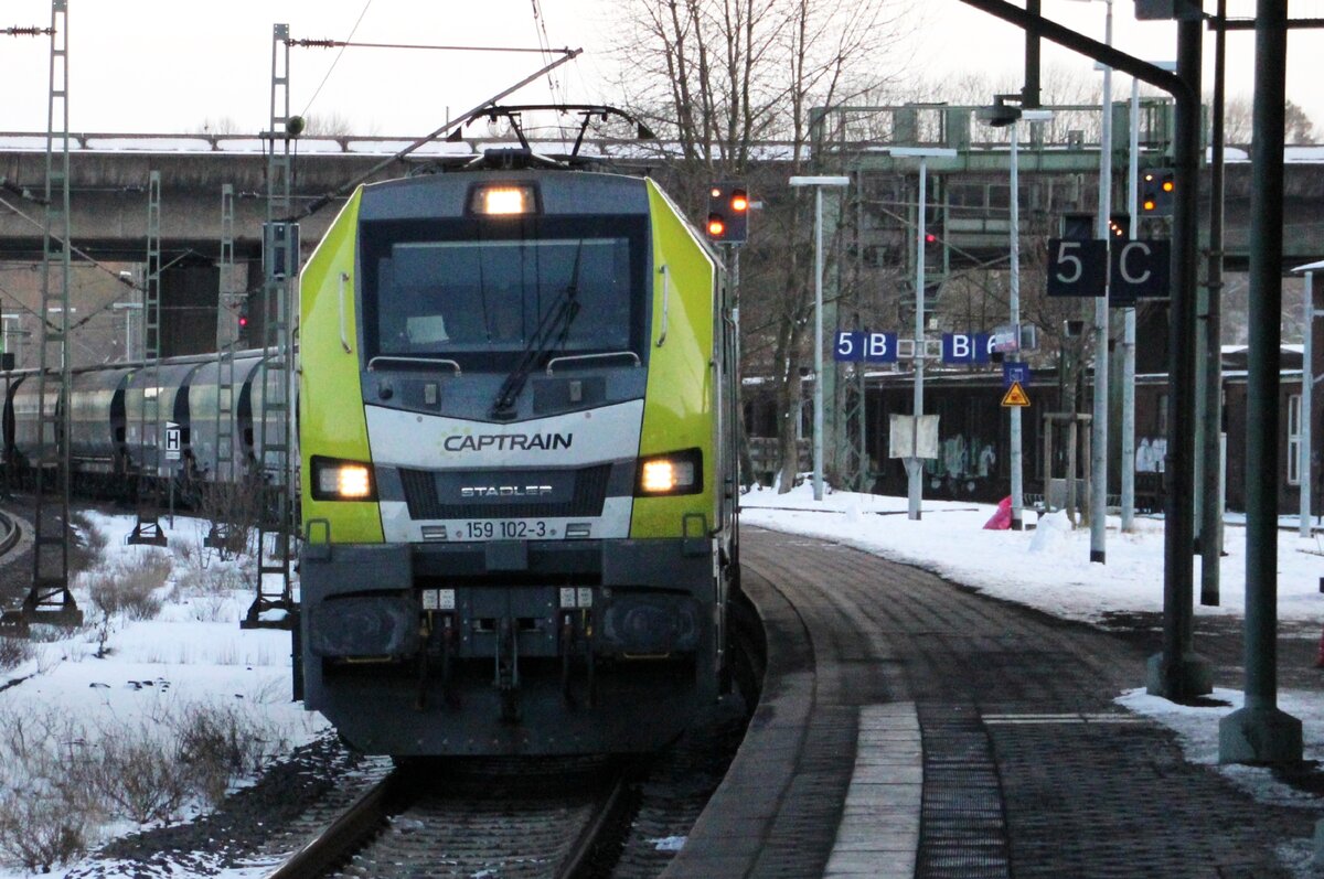 Il 19 febbraio 2026 il sole inizia a tramontare mentre CapTrain 159 102 traina un convoglio di cereali attraverso Amburgo Harburg. Leonardus Schrijvers