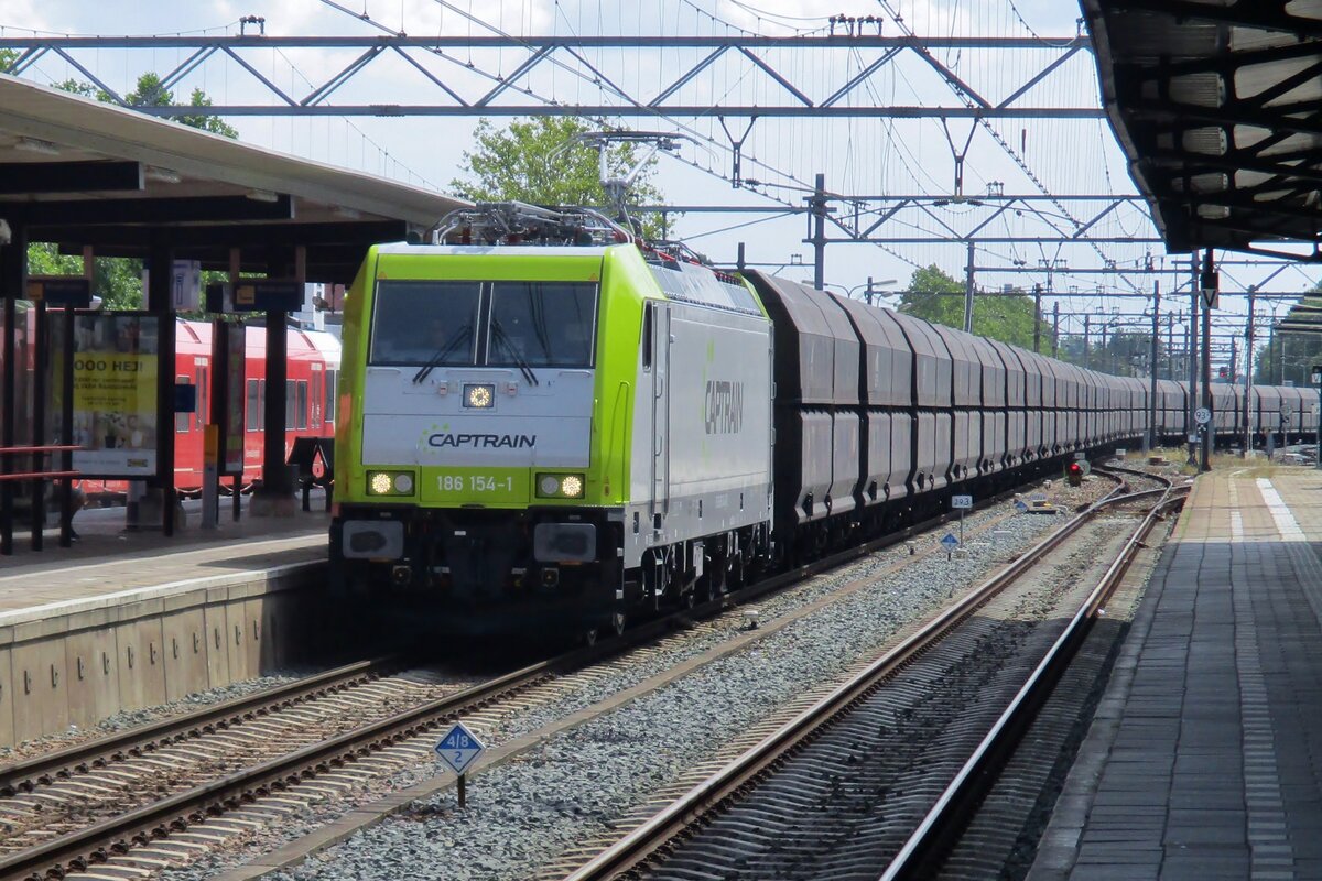 Crossrail/Rhenus 186 269 trekt op 7 juli 2021 de Neuss-container-shuttletrein door Tilburg Reeshof.