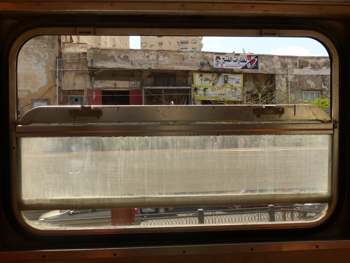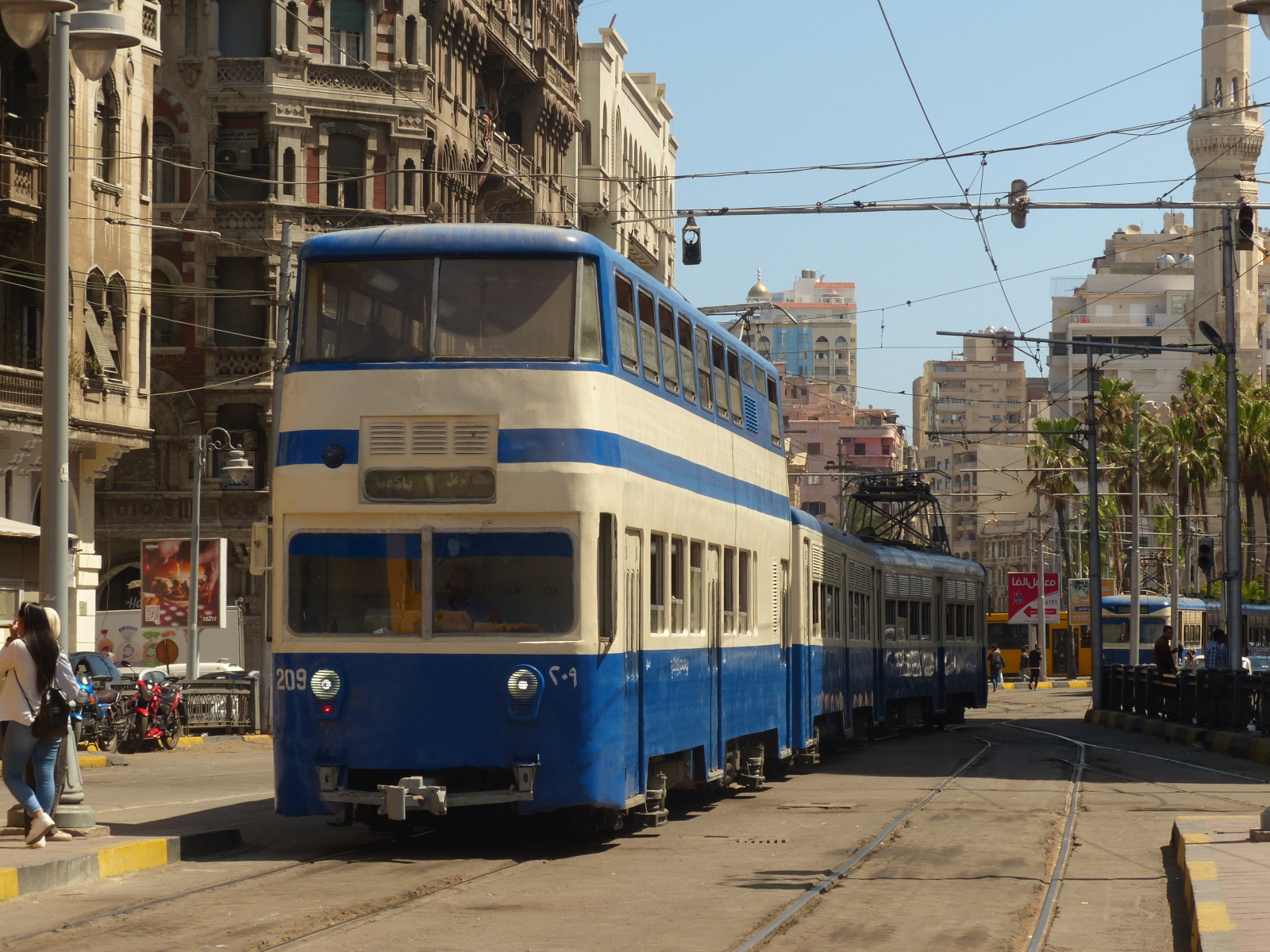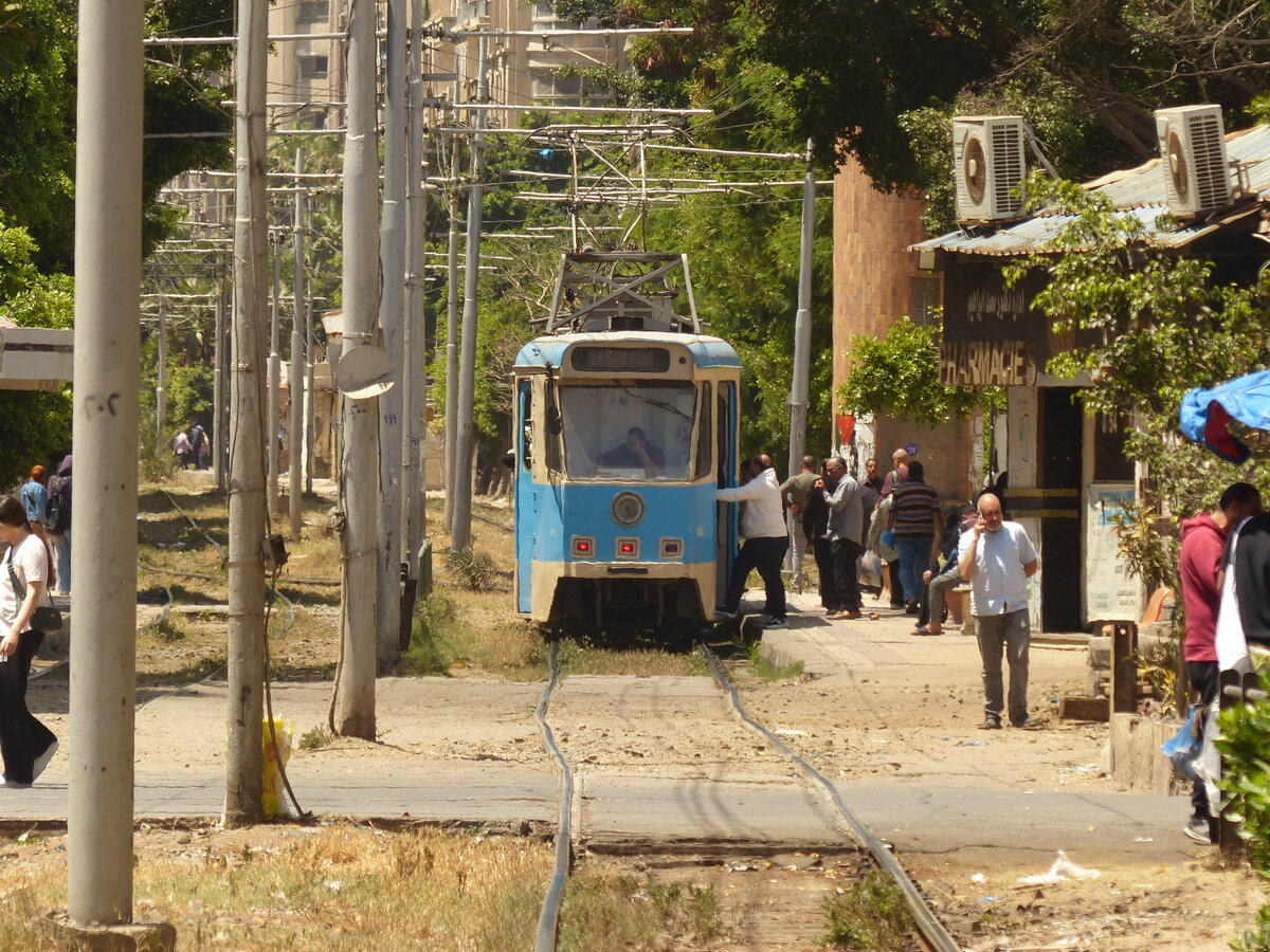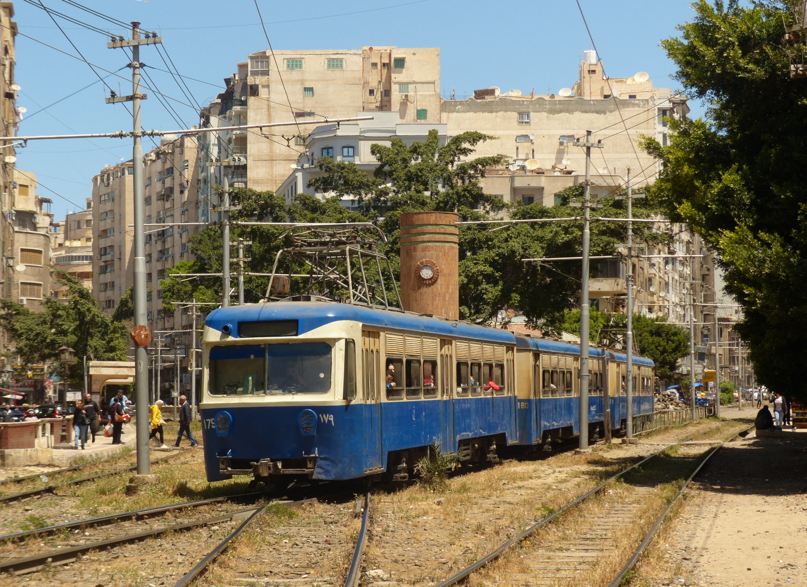 De tram in Alexandrië rijdt op een indrukwekkend lage snelheid, met soms lange wachttijden bij kruispunten; op dit plein deelt hij de ruimte met voetgangers. Aan de sporen is te zien dat hogere snelheden toch niet mogelijk zouden zijn.